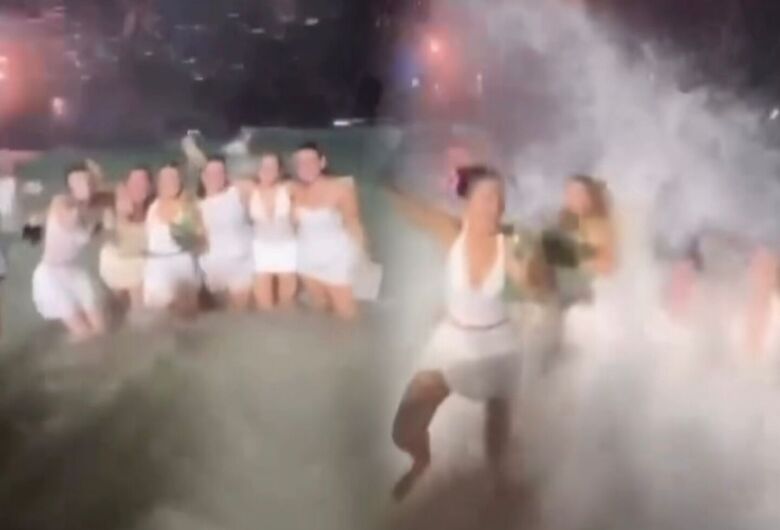 As mulheres estavam de costas para o mar, concentradas na imagem que simbolizaria o início do novo ano. Em questão de segundos, uma onda mais intensa avançou pela faixa de areia e atingiu o grupo, derrubando todas ao mesmo tempo.