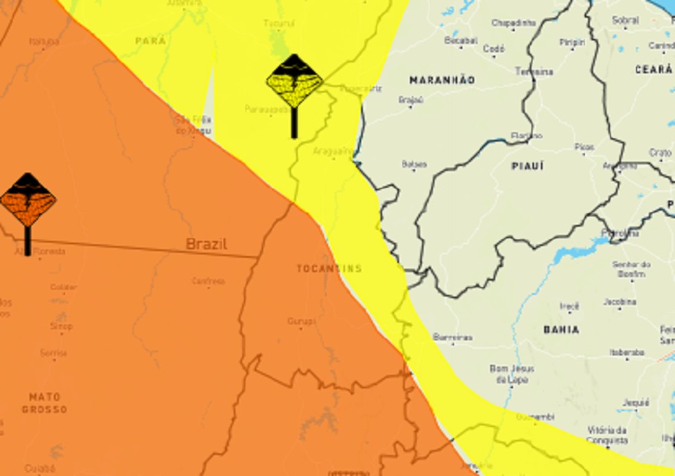 O primeiro alerta, de nível amarelo, vale para toda a região norte e leste, assim como parte da área central e sudeste do Tocantins. A previsão é de chuva de até 50 milímetros com ventos de até 60 km/h.