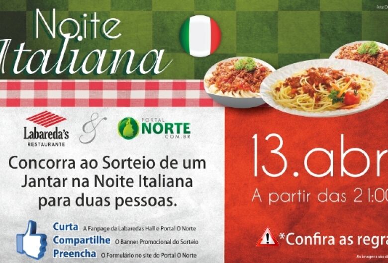 Mais uma promoção especial acaba de ser lançada pelo Portal O Norte, é a promoção “Noite Italiana”. Dessa vez, a pessoa sortuda ganhará um jantar no Labaredas Restaurante com direito a um(a) acompanhante no próximo dia 13 de abril, sábado.