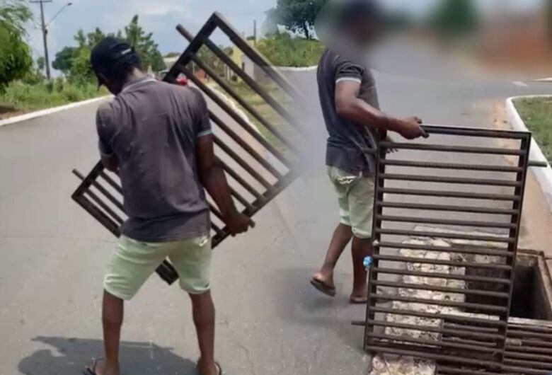 Um homem foi filmado furtando a grade de proteção de uma boca de lobo em uma rua de Araguaína. As imagens mostram o momento em que ele pega a estrutura de metal e a leva embora.