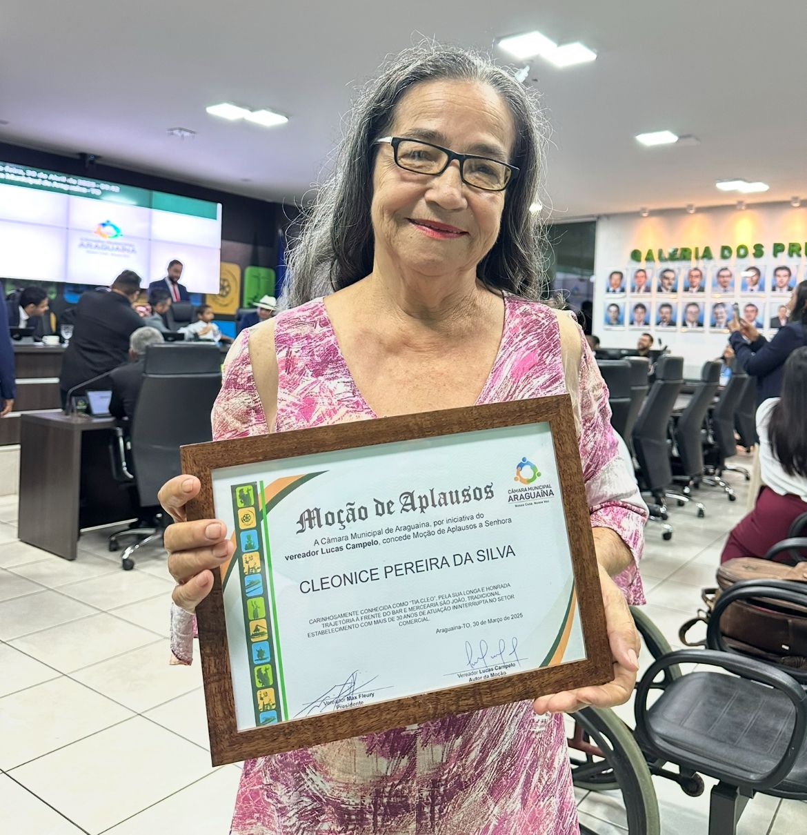 "Hoje tive a alegria de receber uma Moção de Aplausos na Câmara dos Vereadores de Araguaína. Uma homenagem que me enche de gratidão e emoção. é algo que me motiva ainda mais a seguir com propósito, dedicação e amor no que faço", disse Tia Cleo estendendo seu agradecimento ao vereador Lucas Campelo: "Obrigada Lucas, você é um menino de ouro, levo esse reconhecimento com muito carinho!", concluiu.
