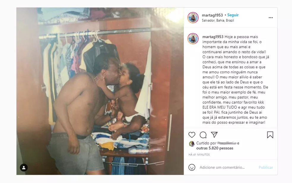 "Hoje a pessoa mais importante da minha vida se foi, o homem que eu mais amei e continuarei amando o resto da vida!! O cara mais honesto e bondoso que já conheci, que me ensinou a amar a Deus acima de todas as coisas e que me amou como ninguém nunca amou!! O meu maior alívio é saber que ele tá ao lado de Deus e que o céu está em festa nesse momento. Ele foi o meu maior exemplo de fé, meu melhor amigo, meu pastor, meu confidente, meu cantor favorito kkk ELE ERA MEU TUDO e agr meu tudo se foi! PAI, fica juntinho de Deus ai que já já estaremos juntos, eu te amo mais do posso expressar e imaginar!"