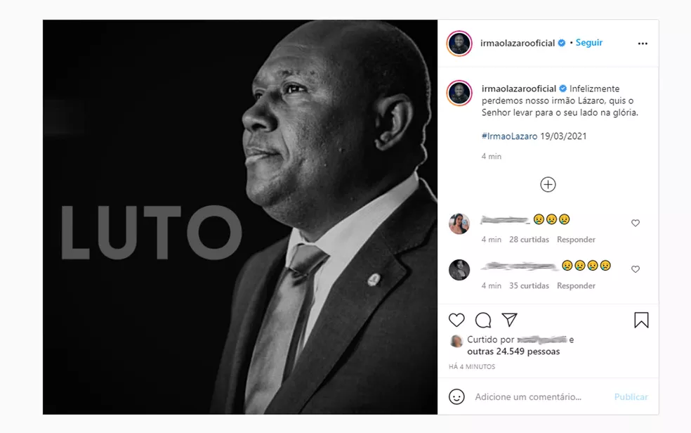"Infelizmente perdemos nosso irmão Lázaro, quis o Senhor levar para o seu lado na glória. #IrmaoLazaro 19/03/2021"