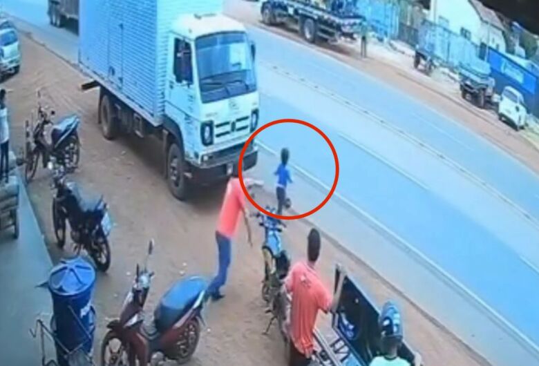 Imagens de uma câmera de segurança mostram pessoas em frente a um comércio na Avenida Araguaia quando, de repente, a criança corre em direção à rua. No mesmo instante, um caminhão passava pelo local.