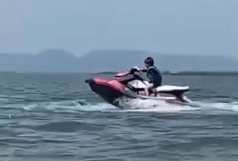 Nas imagens, o menino aparece conduzindo o veículo aquático próximo à faixa de areia onde estavam os banhistas.