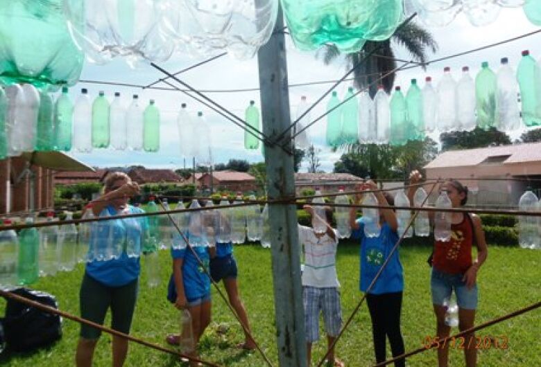 Na arvore montada em frente à Catedral Santa Terezinha, os alunos da oficina de reciclagem utilizaram 670 garrafas Pet, uma chapa de metalon e vergalhões, materiais que foram retirados do lixo.