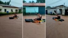 Morador usa caiaque para percorrer rua após forte chuva no interior do TO