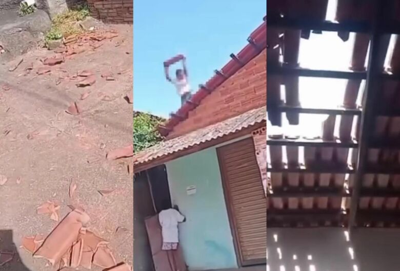 Nas imagens, a mulher que grava a cena relata que o garoto estaria destruindo a casa de uma vizinha. O vídeo mostra parte do telhado comprometido e o chão coberto por pedaços de telhas quebradas, evidenciando o prejuízo causado pela ação.