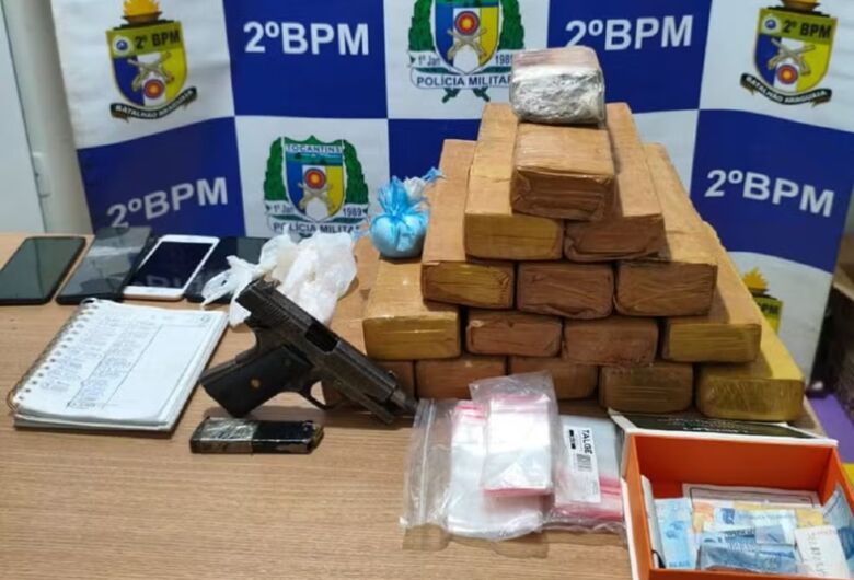 No imóvel, foram apreendidos celulares, embalagens, anotações do tráfico, 77 g de cocaína e R$ 73. A arma jogada pela janela era uma pistola .380 com numeração suprimida e seis munições.