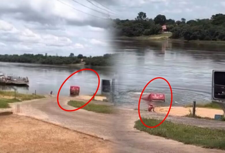 Vídeos que circulam nas redes sociais registram o instante em que a carreta perde o freio, desce a rampa sem qualquer controle e segue direto para dentro do rio. Em poucos segundos, o veículo fica completamente submerso.