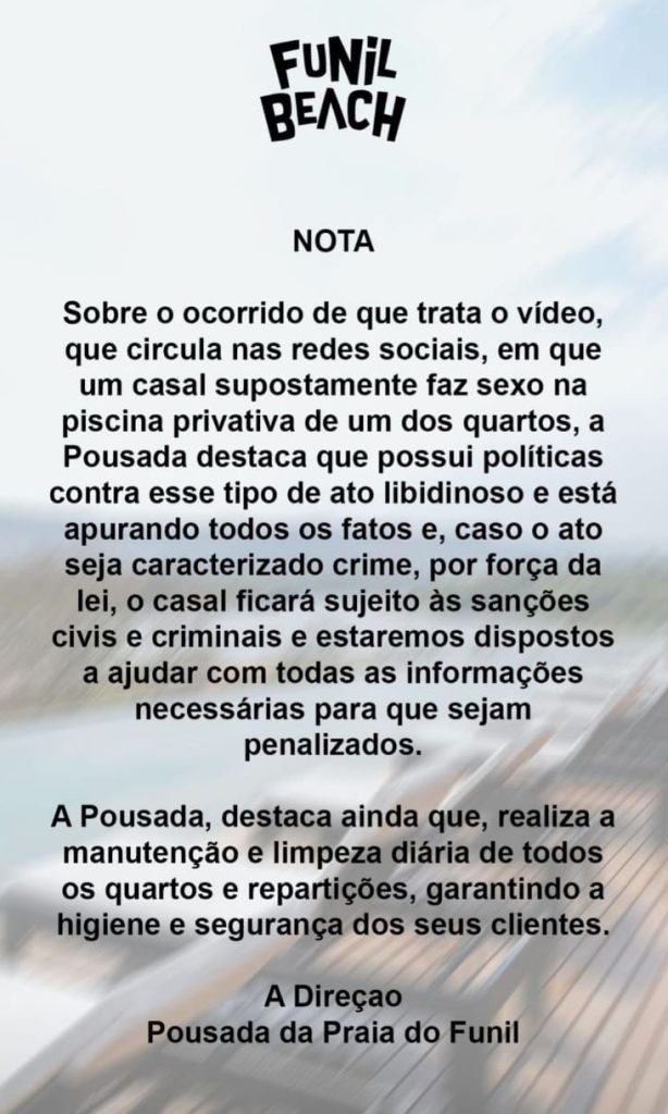 Em nota, a administração da pousada afirmou que possui políticas contra esse tipo de comportamento e está apurando todos os fatos e caso o ato seja caracterizado crime, por força da lei, o casal ficará sujeito às sanções civis e criminais.