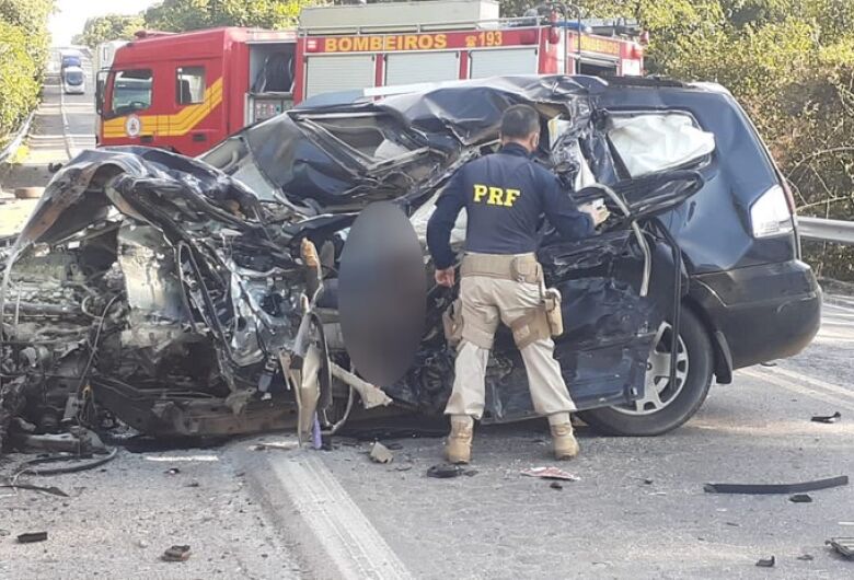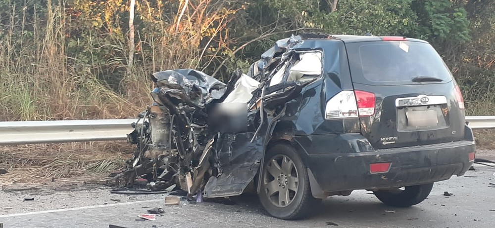 A colisão foi registrada no km 787 da rodovia, quando um veículo invadiu a pista contrária e bateu de frente com um caminhão. O impacto foi tão forte que a frente do carro de passeio ficou destruída e o eixo dianteiro do caminhão foi arrancado.