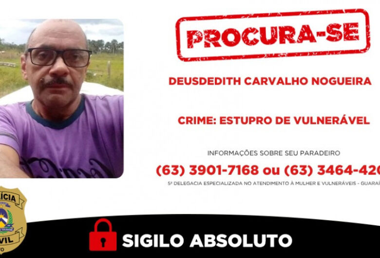 A Polícia Civil do Tocantins está à procura de Deusdedith Carvalho Nogueira, de 65 anos, condenado a 14 anos de prisão em regime fechado pelo crime de estupro de vulnerável. O crime ocorreu em agosto de 2022, em Guaraí. Após ser condenado pela Vara Criminal, o réu tentou recorrer em liberdade, mas, ao tomar conhecimento da sentença definitiva, fugiu.
