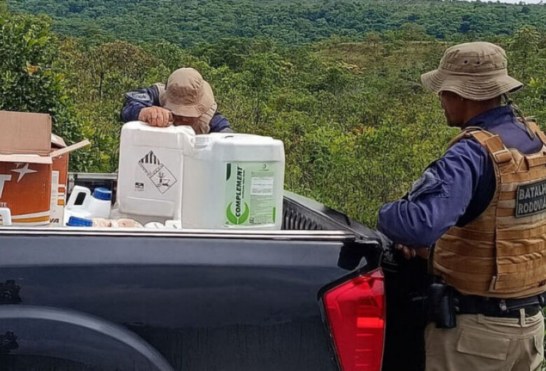 A abordagem aconteceu após os militares pararem uma picape e localizarem 19 galões de 20 litros cada, todos sem nota fiscal e em desacordo com o Art. 56 da Lei 9.605/1998. Entre os produtos apreendidos estão Metch (80 L), Escore Flex (80 L) e Engel Pleno (220 L), substâncias de uso controlado e que exigem transporte certificado.