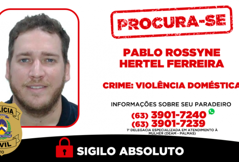 A Polícia Civil do Tocantins está à procura de Pablo Rossyne Hertel Ferreira, investigado por lesão contra a mulher em razão da condição do sexo feminino, injúria, ameaça e porte ilegal de arma de fogo. Ele possui mandado de prisão preventiva em aberto e está foragido. O caso é conduzido pela 1ª Delegacia Especializada de Atendimento à Mulher (DEAM – Palmas).
