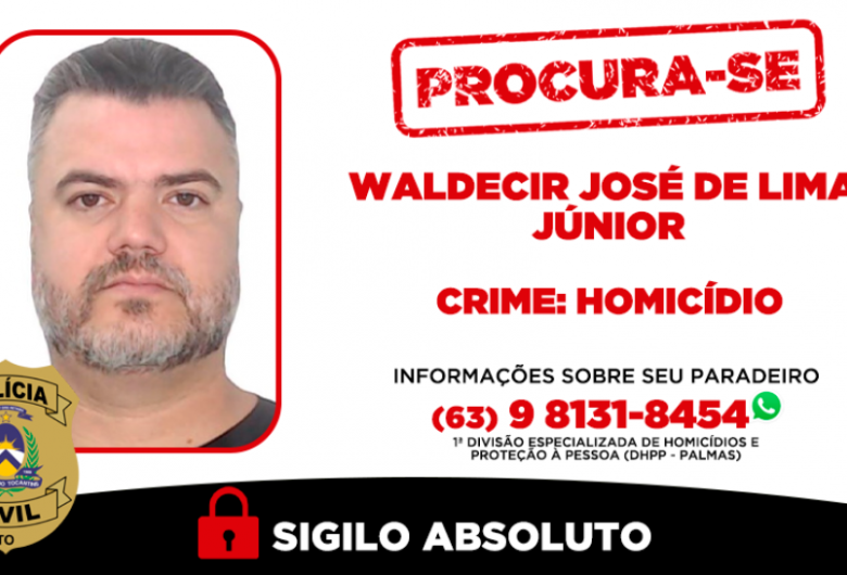 A Polícia Civil do Tocantins procura Waldecir José de Lima Júnior, investigado por homicídio qualificado que vitimou Dhemis Augusto Santos, de 35 anos. O crime aconteceu no sábado (29), no estacionamento de uma galeria na ARSO 21 (203 Sul), em Palmas.