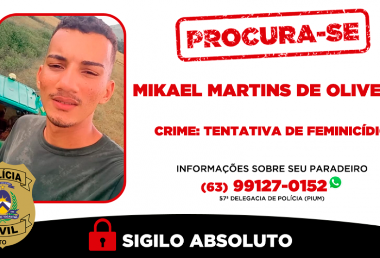 A Polícia Civil do Tocantins está à procura de Mikael Martins de Oliveira, investigado por tentativa de feminicídio contra sua companheira, em Pium.