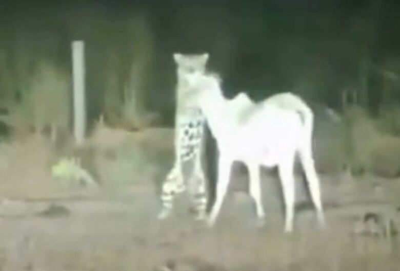 Após alguns momentos a onça largou o bezerro e fugiu. - Crédito: Reprodução