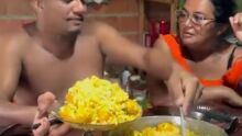 Mãe e filho divertem internautas com panelaço de arroz com pequi